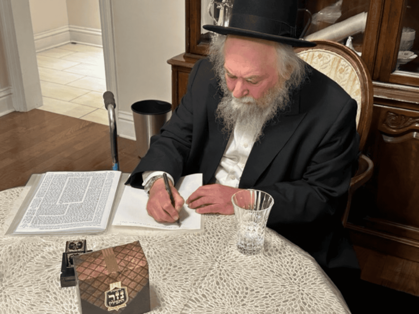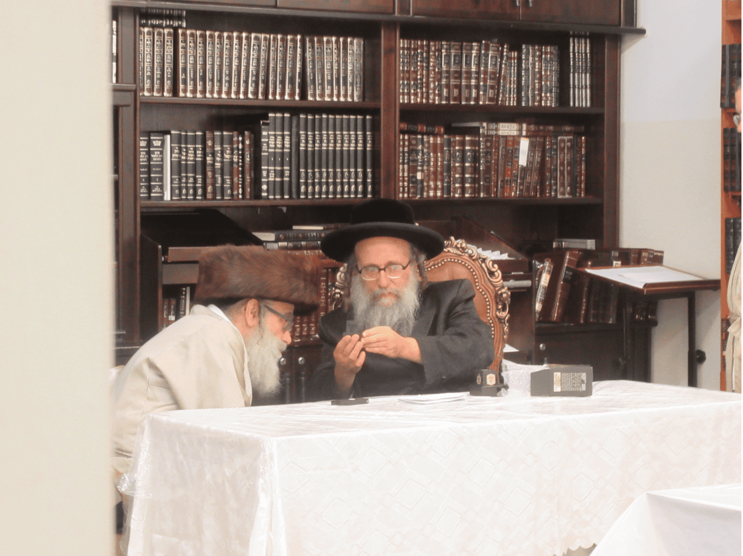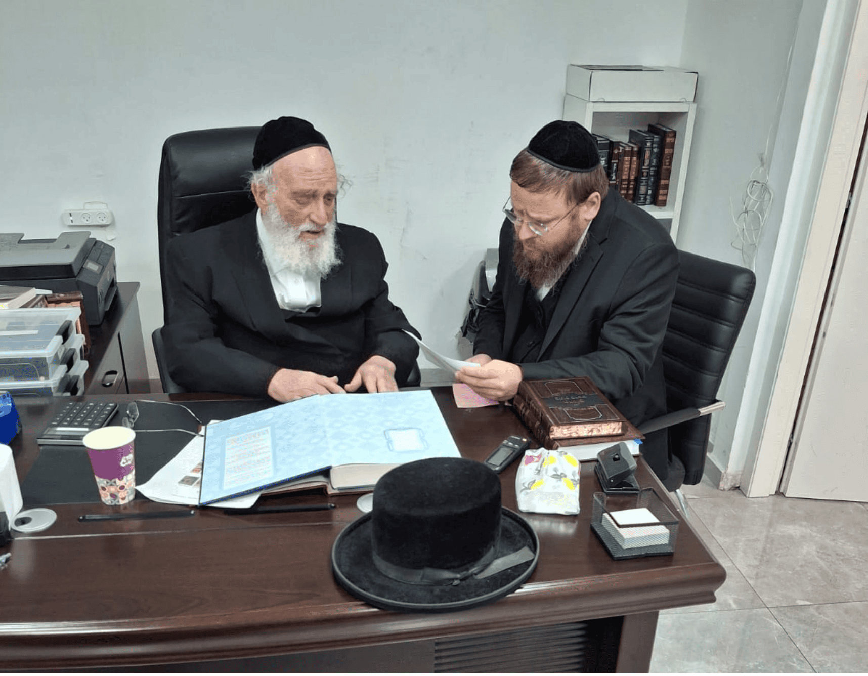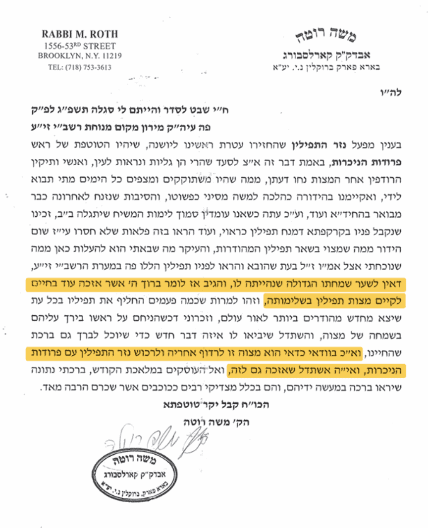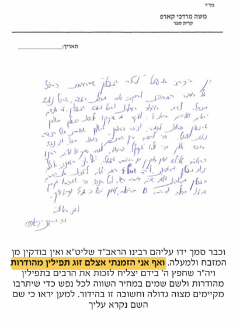 מראה את הפילין לראש ישיבת שער השמים