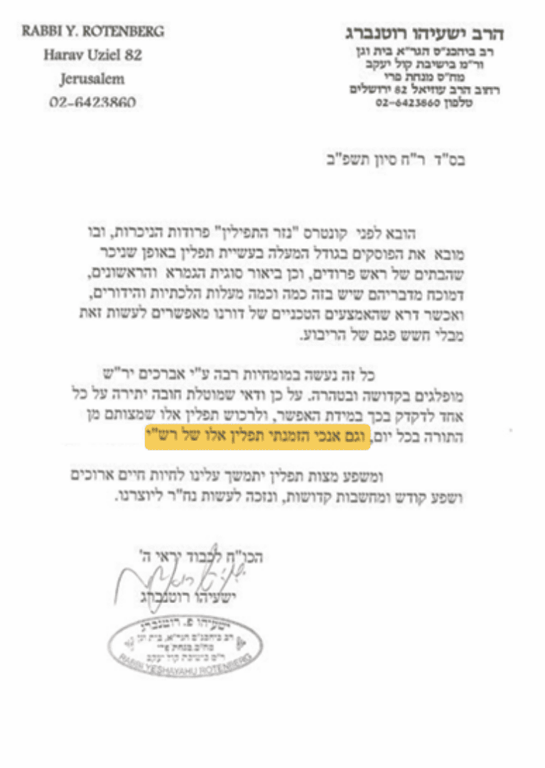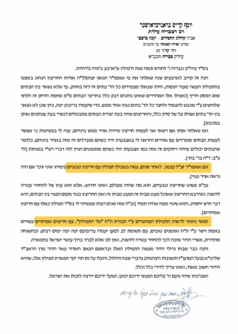 הובא לפני תפילין מהודרות ממפעל “נזר התפילין” שעושים בתים שהם פרודים לגמרי דד’ בתי הראש ניכרים היטב בחכמה יתירה בלי דבק וכ’ו באופן שאינם מתרחבים או נקמצים במשך הזמן אלא עומדים בפרידתן בריבעון כמו בשעת עשיתן ועובדים שם אברכים יר”ש יודעי הלכות ויש שם השגחה מהודרת