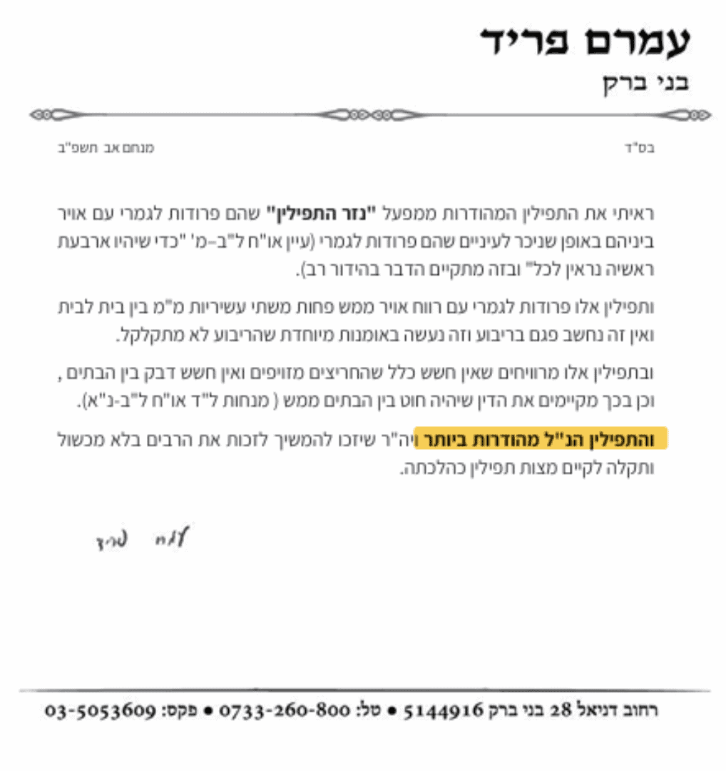 “ואפשר להמליץ על הני תפילין שהם מהודרות מאד ויש הידור גדול לילך עם תפילין שניכר היטיב בפרודות”